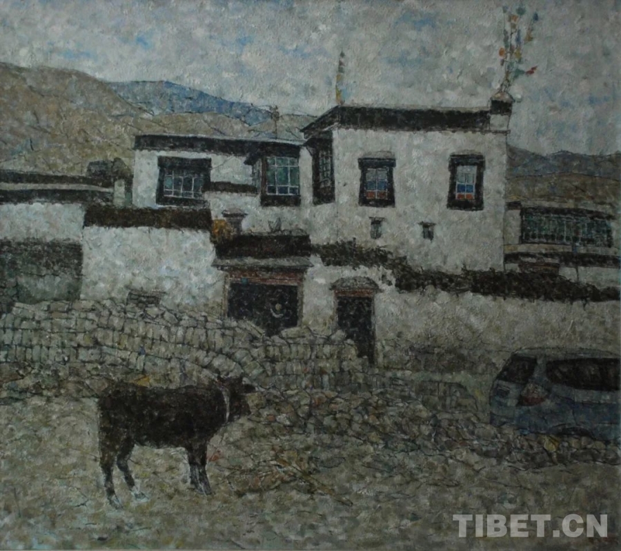 圖為“藍(lán)天白云——雪域高原油畫作品巡展”作品《村寨新景》(120x140cm 布面油畫)作者:格桑次仁