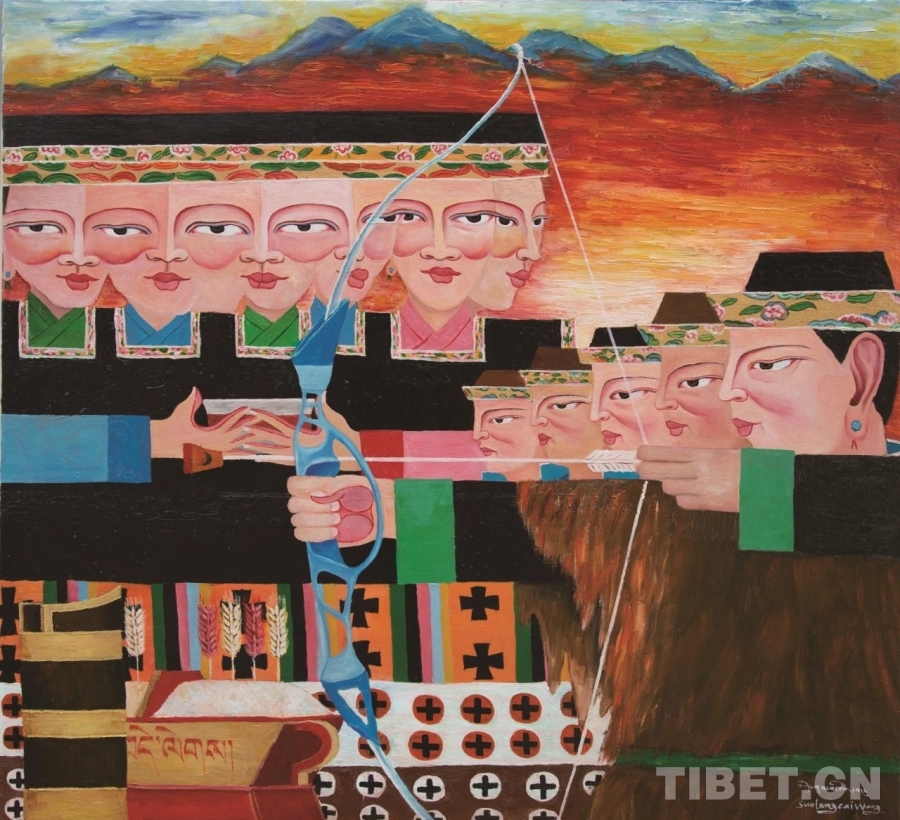 圖為“藍(lán)天白云——雪域高原油畫作品巡展”作品《工布響箭》(100x110cm 布面油畫)作者:索朗才旺