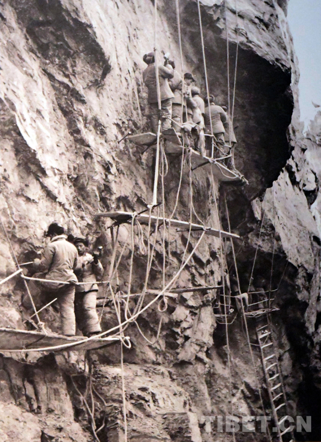 圖為“背著公路進西藏”的十八軍戰(zhàn)士在懸崖上修筑川藏公路 唐召明翻拍