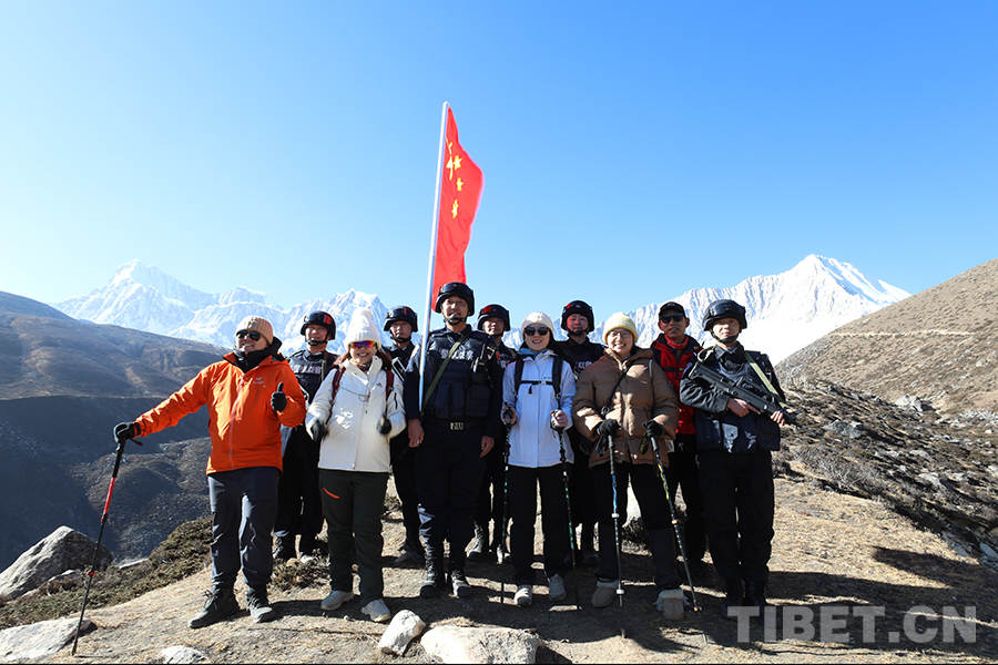 圖為色邊境派出所移民管理警察與游客一起在雪山之下合影