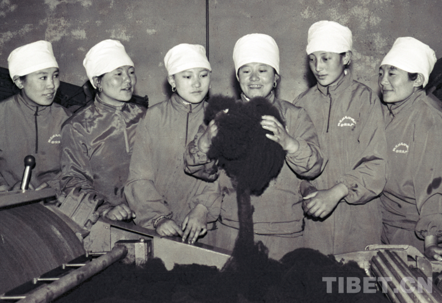 圖為過去手拿牧鞭的牧女格桑措姆(左四)和同伴們在一起分享勞動成果——優(yōu)質牦牛絨。她們都是藏北班戈縣絨毛分梳廠的生產能手(唐召明1994年5月2日攝)