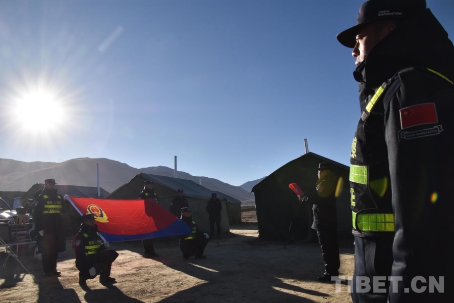 “我是中國(guó)人民警察,我宣誓……” 上午10點(diǎn)20分,隨著激昂的宣誓聲響起,日喀則邊境管理支隊(duì)的領(lǐng)導(dǎo)帶領(lǐng)參與救援的民警面向警旗,重溫入警誓詞,整個(gè)儀式在莊嚴(yán)的中國(guó)人民警察警歌中結(jié)束。宣誓儀式結(jié)束后,安置點(diǎn)的小朋友們?yōu)閰⑴c救援的民警獻(xiàn)上了潔白的哈達(dá),敬禮致敬。這一刻,警民之間的情感紐帶在莊重的氛圍中進(jìn)一步拉近。
