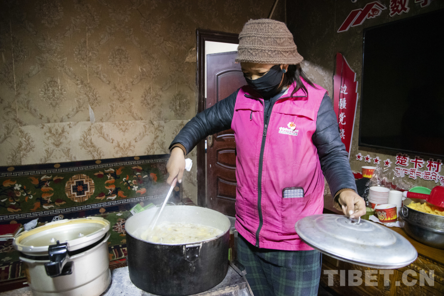 圖為達(dá)娃央宗正在廚房內(nèi)與村巾幗服務(wù)志愿者為村莊老人小孩以及工作人員制作午餐 攝影:趙振宇
