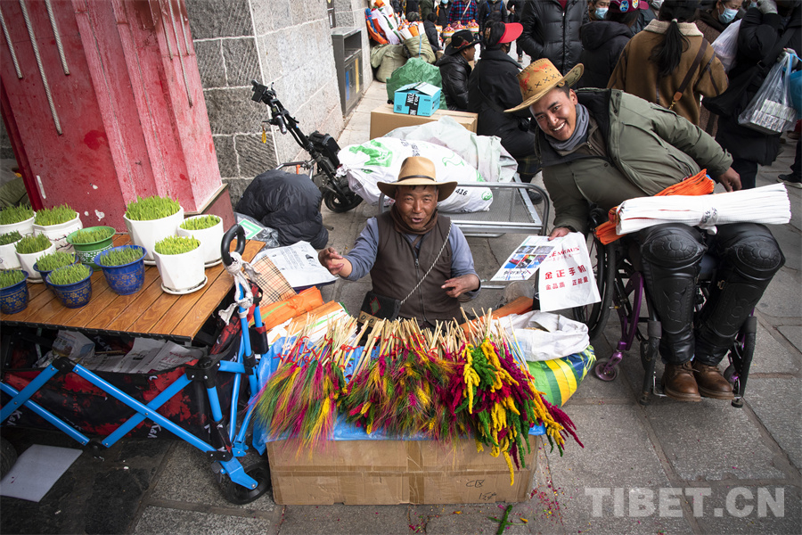 普瓊,來(lái)自日喀則市江孜縣,在八廓商城南門(mén)前經(jīng)營(yíng)著自己的“羅薩梅朵”小攤。初見(jiàn)普瓊,我們被他沖著鏡頭的燦爛笑容所吸引。細(xì)細(xì)觀察,普瓊坐在地上的身高卻比別人矮了一大截?!拔覀儚睦_堆龍德慶的批發(fā)市場(chǎng)上買(mǎi)來(lái)這批‘羅薩梅朵’在此銷售,就希望能夠在年前的這段時(shí)間多賺些小錢(qián)補(bǔ)貼家用,所有人都想在新年之時(shí)過(guò)個(gè)充裕的‘好年’,不是嗎?”普瓊因一次意外高位截癱,失去雙腿的他并沒(méi)有消沉。他選擇積極面對(duì)生活,用自己的雙手和命運(yùn)抗?fàn)?,用?jiān)強(qiáng)和勤勞讓自己和全家過(guò)上更好的生活。與普瓊不幸的經(jīng)歷相比,我們每個(gè)人過(guò)的每個(gè)年何嘗不都是一個(gè)個(gè)“好年”呢?普瓊對(duì)生活的那種熱愛(ài),對(duì)明天會(huì)更好的堅(jiān)定,何嘗不是我們對(duì)每一個(gè)“好年”所孜孜追求的呢?