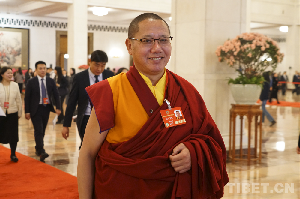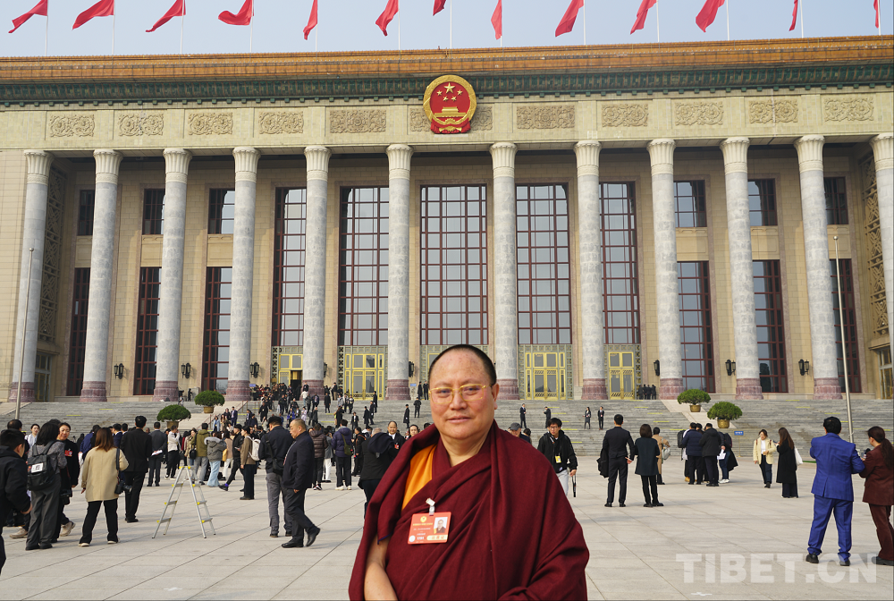 圖為全國政協(xié)委員達扎·尕讓托布旦拉西降措在人民大會堂前 攝影:楊眉笑