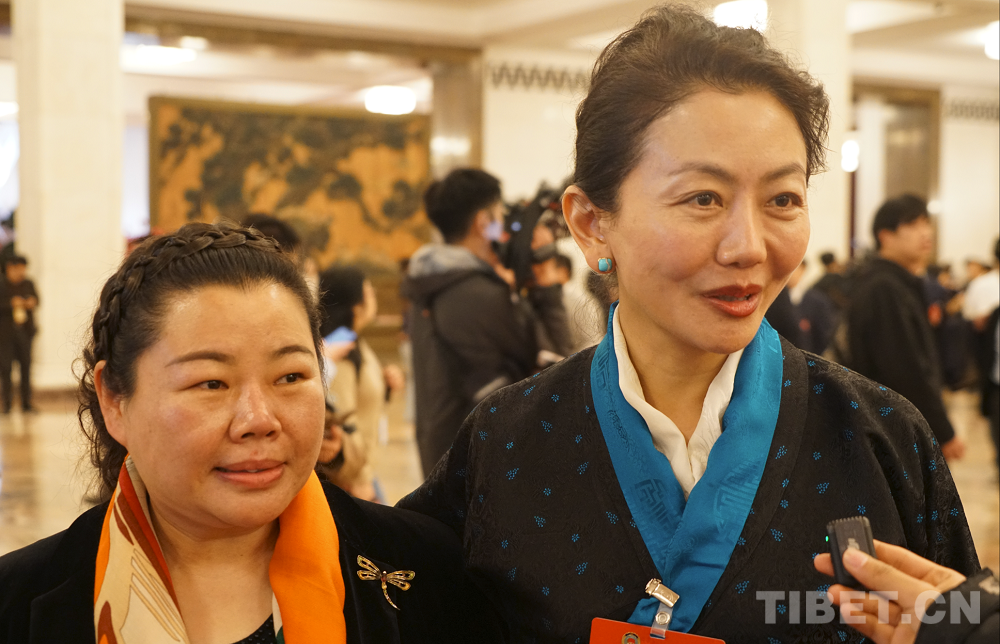 圖為全國政協(xié)委員邊巴拉姆(右一)接受記者采訪 攝影:楊眉笑
