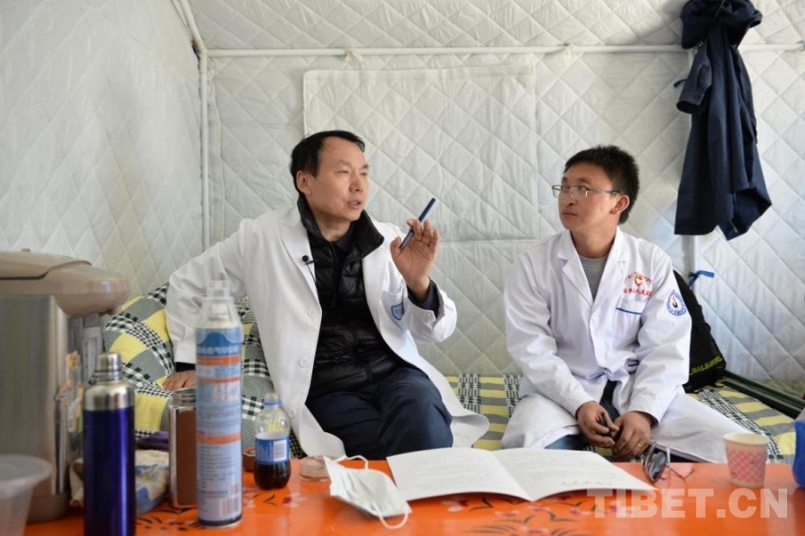 圖為2021年,余震中,王建六(左)帶領(lǐng)團隊赴青海省瑪多縣開展宮頸癌篩查,在帳篷辦公室里與當?shù)蒯t(yī)務(wù)工作者交流 北京同心共鑄公益基金會供圖