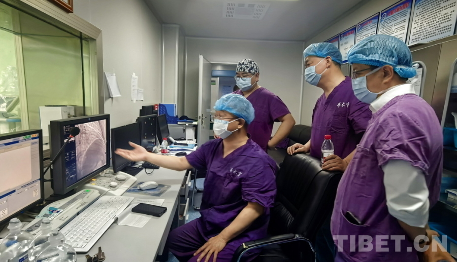 圖為陰赪茜(手術(shù)室內(nèi)右)趕赴阿壩州人民醫(yī)院手術(shù)救治急性心?;颊撸聊簧巷@示出陰赪茜正操作纖細(xì)的導(dǎo)絲嘗試通過(guò)患者發(fā)生閉塞的心臟血管 攝影:劉莉