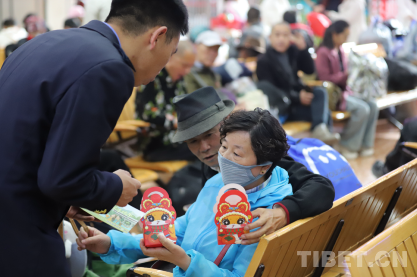 圖為拉薩車站工作人員為候車旅客送上端午小禮包