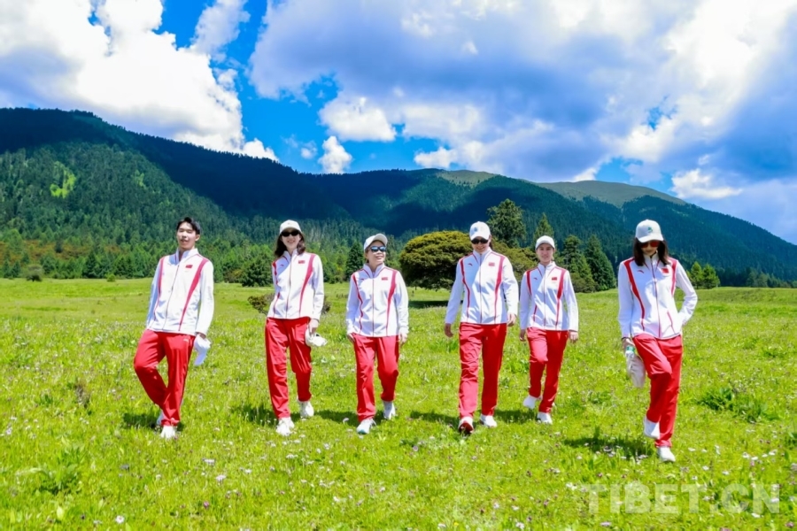 圖為奧運(yùn)冠軍走進(jìn)魯朗鎮(zhèn)高山牧場,被牧場風(fēng)光深深吸引