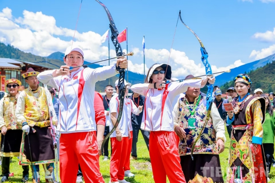 圖為奧運(yùn)冠軍同當(dāng)?shù)卮迕褚煌w驗西藏傳統(tǒng)體育項目工布響箭