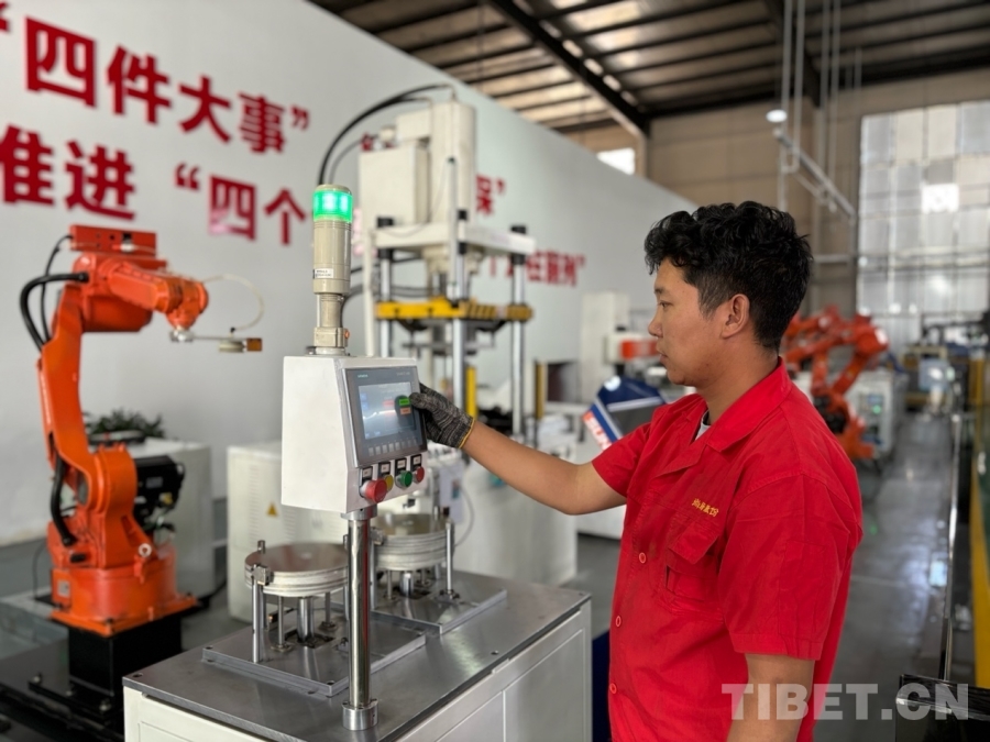 圖為員工益西多吉正在進行煎鍋自動化制作