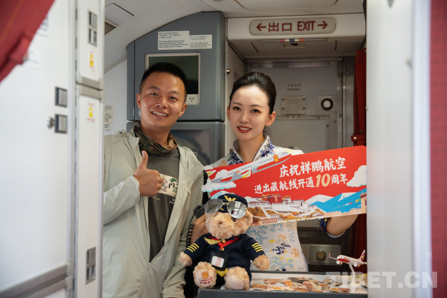 在當天從喀什飛往阿里的航班上,祥鵬航空策劃開展了主題活動,慶祝航線開通10周年以及西藏自治區(qū)成立60周年。搭乘航班的每位旅客均收到了潔白的哈達;有獎問答環(huán)節(jié)氣氛熱烈,客艙內(nèi)笑聲與掌聲此起彼伏;旅客分享的自己與高原的故事,更令不少人動容。航班在祝福、歡樂與感動中飛向雪域高原。