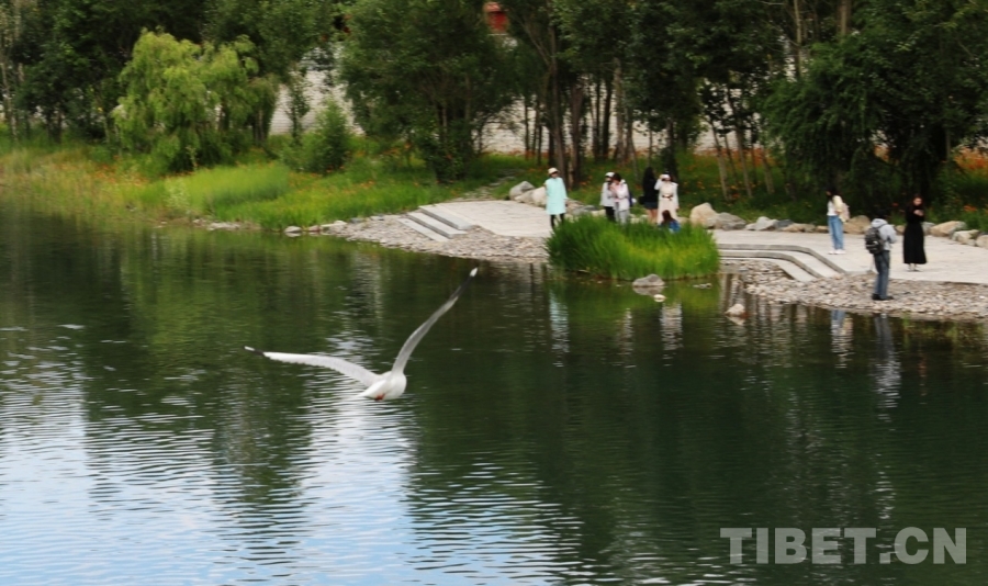 圖為拉薩兩島內(nèi)河綠色生態(tài)廊道一隅,水鳥在天空中飛過 攝影:劉莉