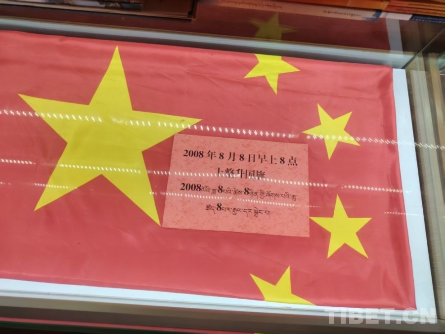 圖為古曲扎巴老人珍藏的2008年8月8日早8點(diǎn)所升的國旗 攝影:王東