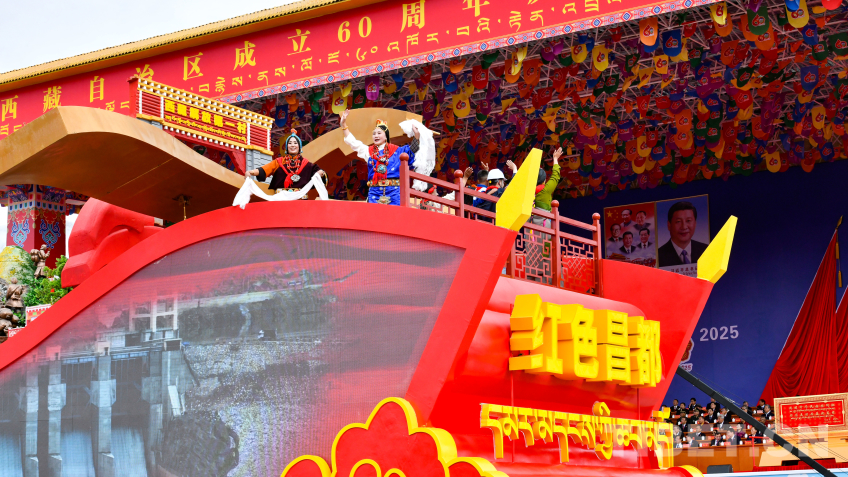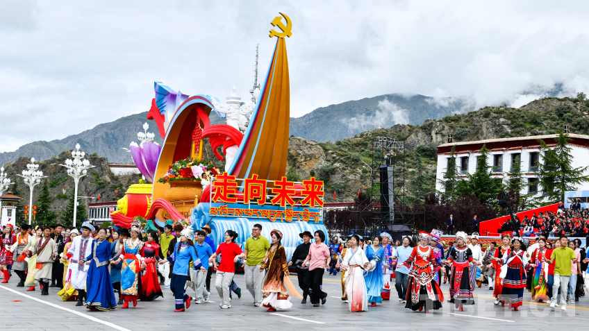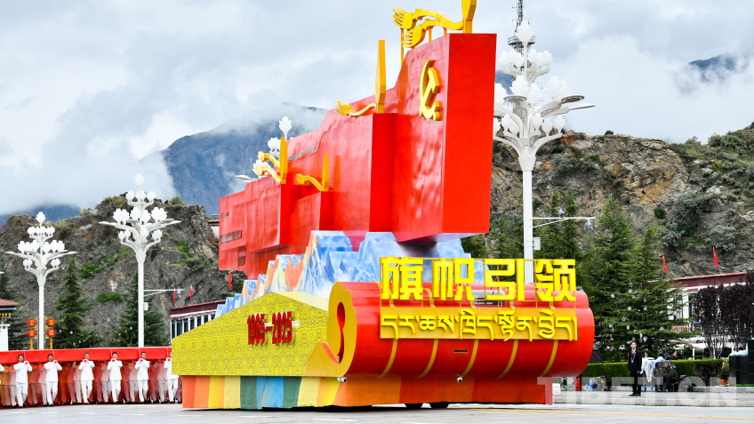 “旗幟引領(lǐng)”彩車,車頭矗立巨型黨旗,八面五星紅旗有序排列其后,展現(xiàn)了在黨中央堅(jiān)強(qiáng)領(lǐng)導(dǎo)下,西藏各族兒女同心同向、團(tuán)結(jié)奮進(jìn)的時代圖景。