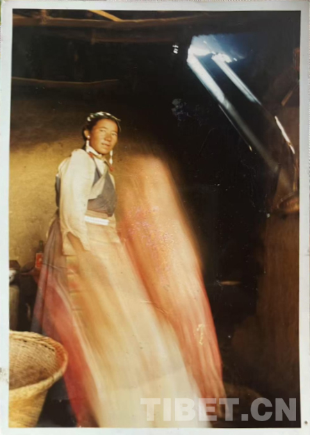 這是在我們家老房子門口照的。那時(shí)候全是土坯房,這間是四間房里最大的。大概是1990年左右。記得穿的這身衣服那些年很多人都穿,應(yīng)該是軍裝,穿著這衣服騎馬去挖藥很多次。人民公社時(shí)期我們有八個(gè)生產(chǎn)隊(duì),那時(shí)候要采藥掙工分,偶爾拉薩藏醫(yī)院的老師們會(huì)專程來札達(dá),我們也要幫忙去采藥。這邊藥材很多,如雪蓮花、黃連、蒂丁等。拍這張照片時(shí)孩子的鞋和幾件衣服是我自己織的,但要買好衣服還得去阿里地區(qū)。那時(shí)我丈夫已經(jīng)在開車,我們家條件稍好些,但也不是村里最好的。