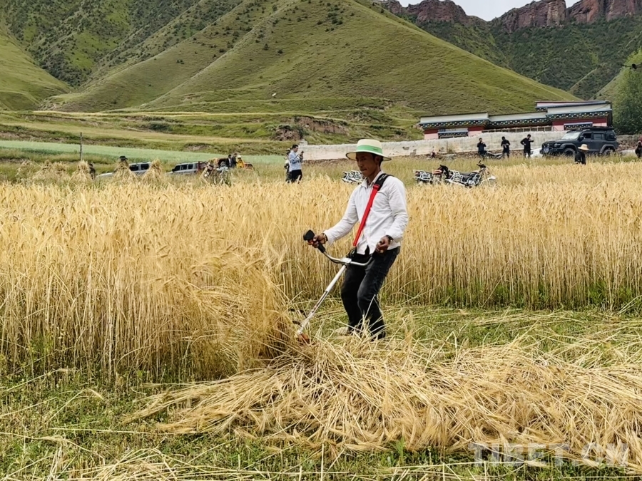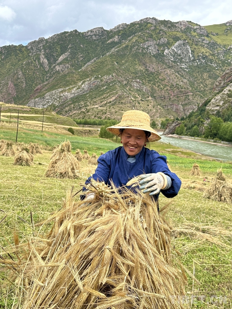 眼下,飽滿的青稞穗隨風(fēng)搖曳,村民們熟練地彎腰、揮鐮、捆扎,田間地頭呈現(xiàn)出一派繁忙景象?!敖衲暧晁?,青稞長得也比往年好。”一位村民一邊笑著,一邊向我們展示剛剛捆好的青稞麥堆。