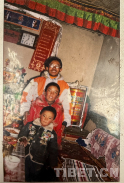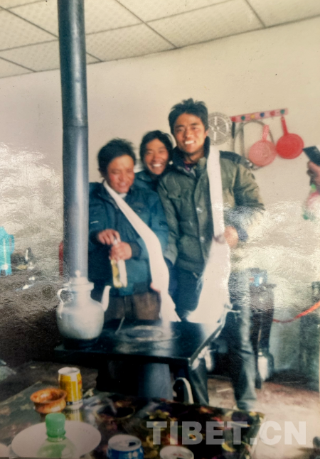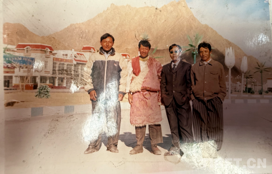 這是九十年代在阿里拍的,拍攝地點(diǎn)是現(xiàn)在的康樂新區(qū)。從照片上可以看到,那時(shí)候阿里建設(shè)得挺好。右邊第一個(gè)穿燈籠褲的是我。這種褲子當(dāng)時(shí)特別流行,年輕小伙子們穿上可高興了。穿藏袍的是我弟弟,那時(shí)他還是個(gè)普通牧民,后來通過自己的努力,已經(jīng)是我們的村長了。戴墨鏡的是我們同村的,開車時(shí)和人發(fā)生沖突打壞了眼睛,去內(nèi)地治療花了十多萬。后來因?yàn)檠劬栴}駕照被注銷,也就沒辦法繼續(xù)開車了,現(xiàn)在在拉薩當(dāng)保安。當(dāng)時(shí)他正好在阿里開出租車,我們找到他一起拍了這張照片。左邊的大個(gè)子現(xiàn)在開了個(gè)商店和茶館,生意不錯(cuò)。