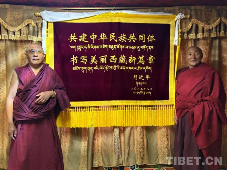 中央代表團向孝登寺贈送了習近平總書記題詞的“共建中華民族共同體 書寫美麗西藏新篇章”賀幛。土登對此深有感觸:“‘共建中華民族共同體’意味著56個民族共同致力于中華民族的偉大夢想;‘書寫美麗西藏新篇章’是指西藏從1965至今發(fā)生巨變,我們正在此基礎上創(chuàng)造更美好的未來。”