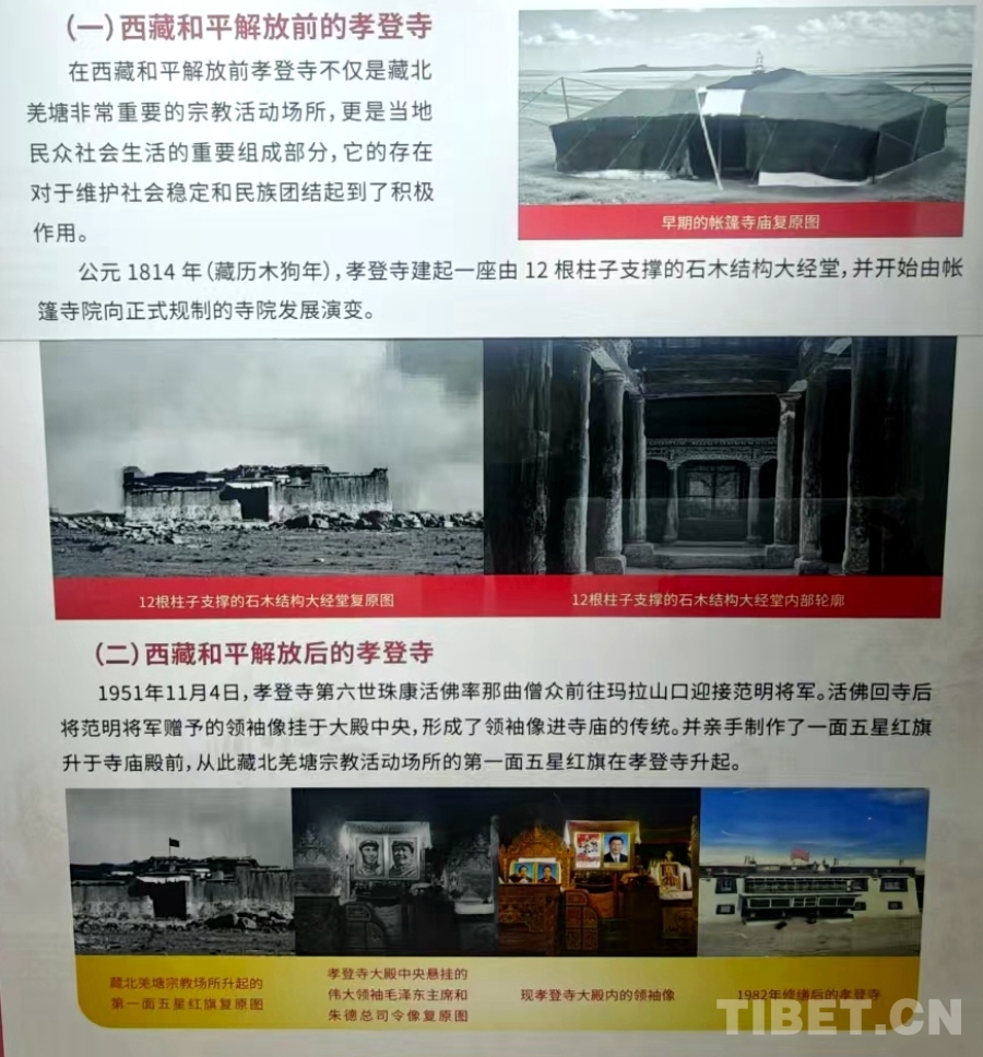 走進孝登寺,主殿正中央懸掛的領袖像莊嚴醒目。據(jù)孝登寺管委會副書記、主任羅布旺秋介紹,1951年,范明將軍率解放軍途經那曲時,六世珠康活佛力排眾議前往馬拉山迎接。范明將軍向僧眾宣講黨的民族宗教政策,并向六世珠康活佛贈送了毛主席和朱總司令畫像。此后,六世珠康活佛將領袖像敬懸于大殿正中,這一傳統(tǒng)延續(xù)至今。他還親手制作并升起了藏北寺廟中的第一面五星紅旗。