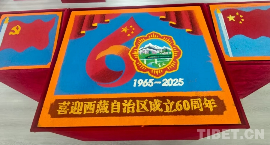 圖為孝登寺鑄牢中華民族共同體意識展覽館內,該寺僧人特別為西藏自治區(qū)成立60周年精心自制的沙畫