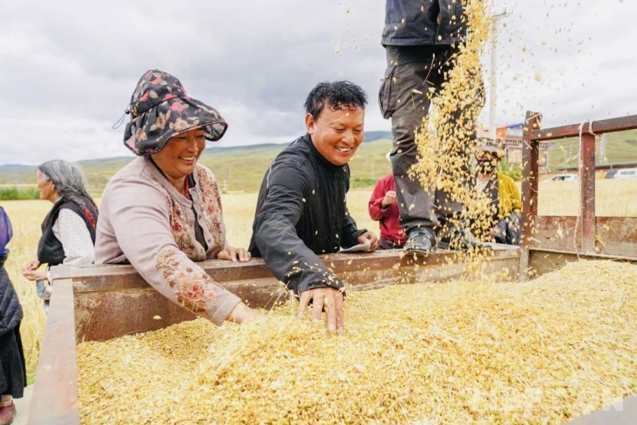中國(guó)西藏網(wǎng)訊 8月29日,四川省甘孜藏族自治州甘孜縣拖壩鄉(xiāng)拖壩四村的500畝青稞基地里,收割機(jī)轟鳴作響,飽滿(mǎn)的青稞穗被整齊收割。甘孜縣12萬(wàn)畝青稞陸續(xù)成熟,高原上一片金黃。據(jù)甘孜縣農(nóng)牧農(nóng)村和科技局?jǐn)?shù)據(jù)顯示,今年全縣青稞預(yù)計(jì)總產(chǎn)量達(dá)27805噸,較去年增長(zhǎng)4.9%,再創(chuàng)歷史新高。