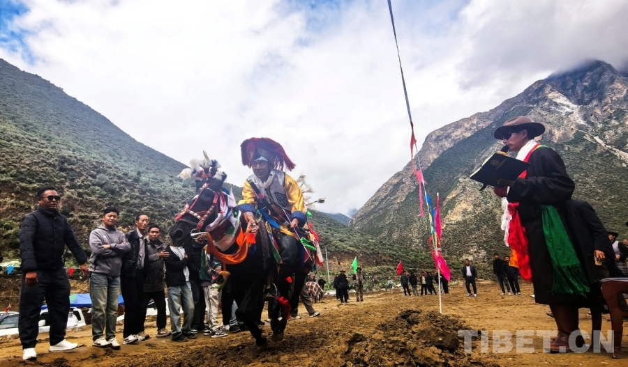 圖為西藏自治區(qū)山南市貢嘎縣昌果鄉(xiāng)普夏村望果節(jié)賽馬會上村里請來的民間藝人(圖右)擔任主持人介紹出場騎手 攝影:劉莉