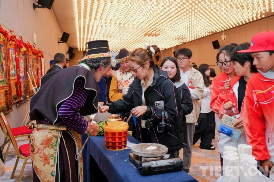 活動現(xiàn)場還設置了茶歇區(qū)、展覽閱讀區(qū)和非遺體驗區(qū)。嘉賓們品嘗工布阿拉酒與藏式茶點,欣賞青年藝術家畫作和林芝主題圖書,并親身體驗藏香制作、藏文書法、藏紙拓印等非遺項目,多維度感受林芝文化的生機與魅力。