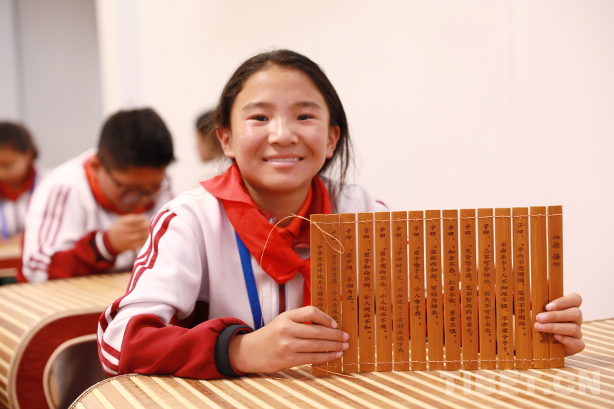 “子曰:‘學(xué)而不思則罔,思而不學(xué)則殆?!娰t思齊焉,見不賢而內(nèi)自省也?!卟换?,仁者不憂,勇者不懼?!敝窈喪止ふn堂上,孩子們將打磨光滑的刻字竹片用牛筋線仔細(xì)編連成冊?!巴瑢W(xué)們要記住,繩子折疊后要保持長度一致,位于竹簡上方的繩子向上穿孔,下面的繩子向下穿孔而過,這樣能保證竹片緊密相連,即‘上上下下’原則?!痹诶蠋熛ば牡闹笇?dǎo)與幫助下,孩子們稚嫩的雙手上下翻飛,很快便將散落的竹簡按照刻字排列整齊,并編織成冊。來自阿里噶爾縣昆莎鄉(xiāng)的巴桑卓瑪說道:“編竹簡需要繩子不斷交織,與藏族的紡織工藝有些相似。通過這次手工,我感受到了古人的智慧與中國傳統(tǒng)文化的神奇奧秘?!闭窍裰窈啞⒓垙堃粯拥奈幕d體,才讓先賢哲人的深邃智慧以文字的形式流傳至今,被千年后的人們傳承誦讀。
