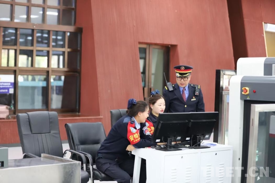 圖為拉薩火車站客運值班員任巨鵬(右)了解車站安檢動態(tài)