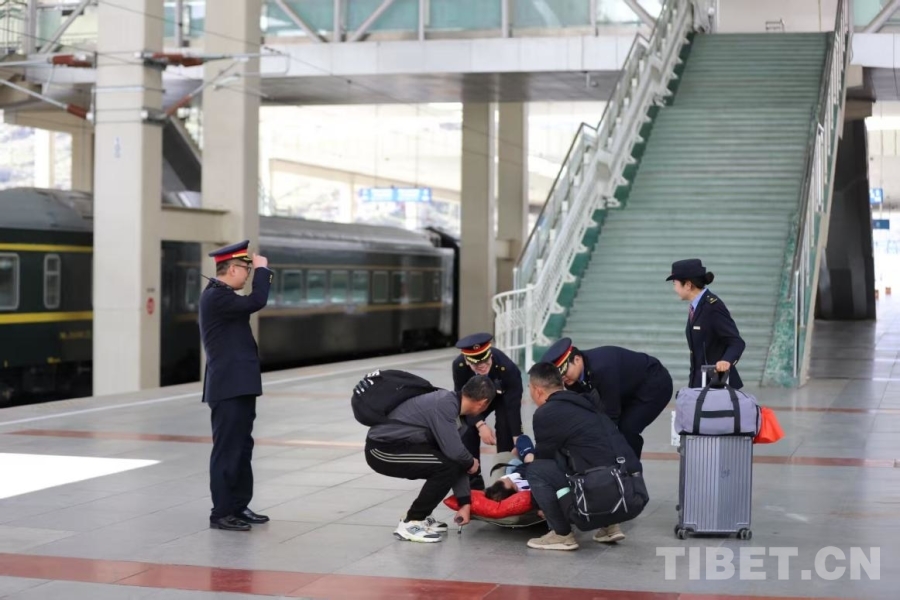圖為拉薩火車站客運值班員對特殊旅客提供特殊轉運幫助