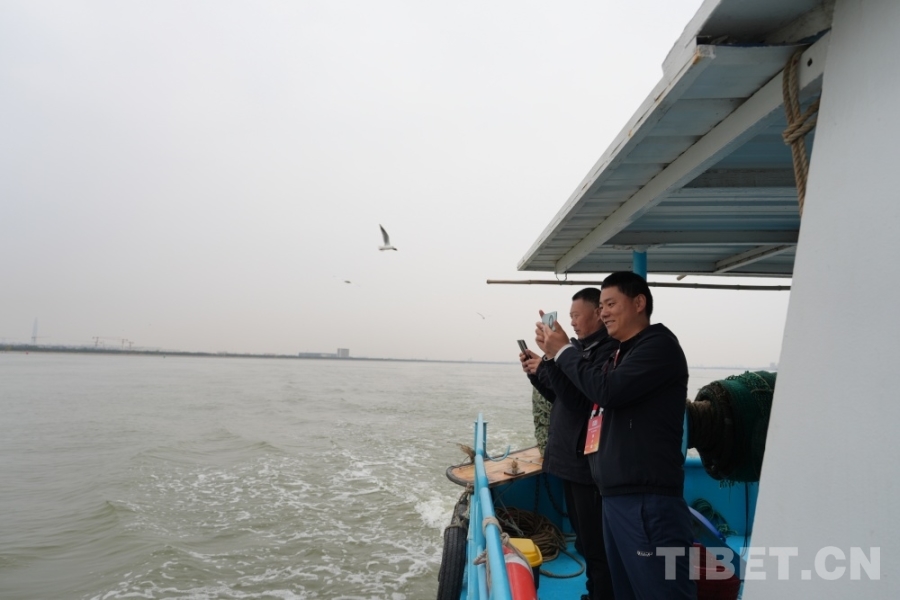 圖為西藏基層干部學(xué)習(xí)參觀團(tuán)成員在甲板上觀看捕魚 攝影:王茜