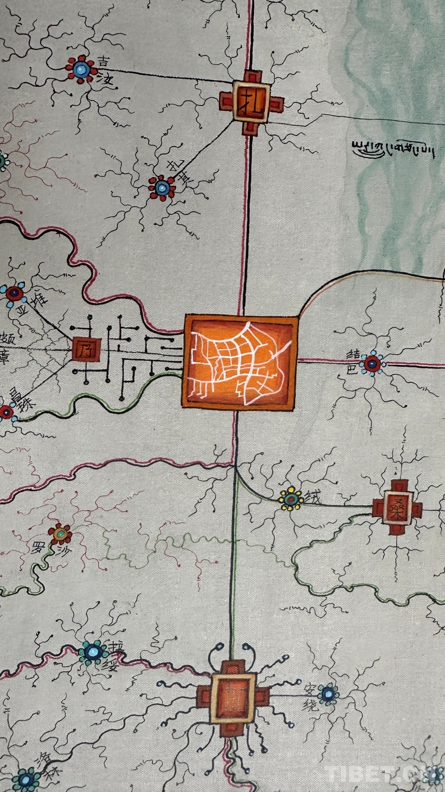 達(dá)布詳細(xì)解釋了這幅唐卡的圖像系統(tǒng):正方形代表市、區(qū),內(nèi)部畫有該市區(qū)主干道地圖;十字方形代表縣;圓形寶石形代表鄉(xiāng)鎮(zhèn);藏文“嗡”字代表名勝古跡;此唐卡以黑線為所有公路基礎(chǔ)線,黑線邊上的紅黃線代表國道和高速,綠線代表省道,黑細(xì)線代表縣鄉(xiāng)鎮(zhèn)及村級公路。沿途還繪制了珠峰、古格王國遺址、納木錯等代表性景點,并用藏文標(biāo)注名稱。