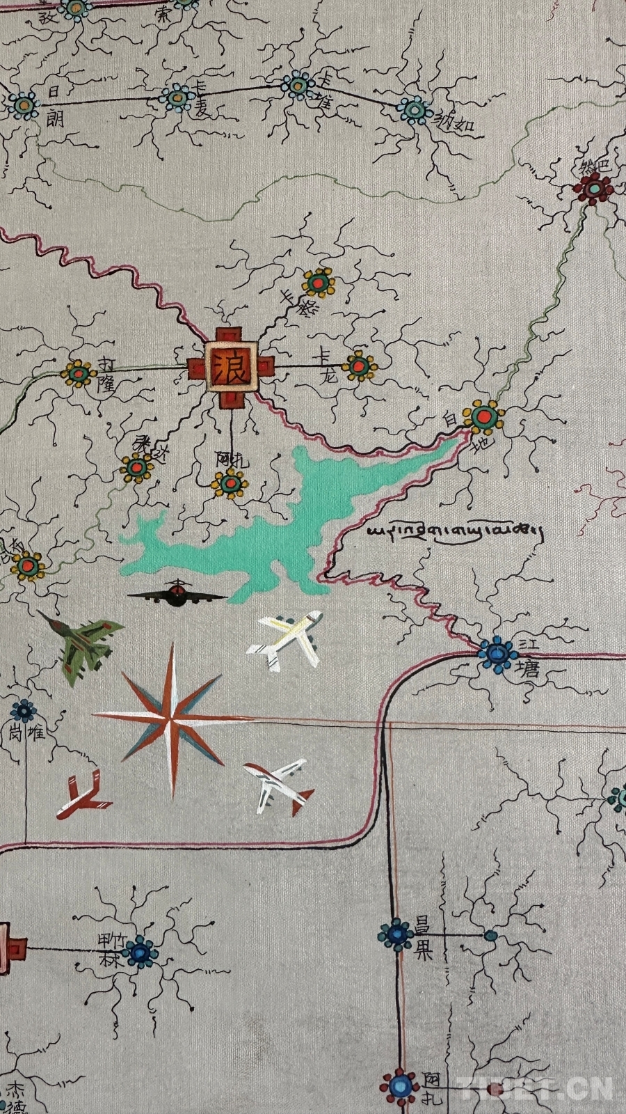 作為一件與地圖密切相關(guān)的作品,達(dá)布主要依據(jù)公路主線和國家公布的行政區(qū)域進(jìn)行描繪,對于一些在常用地圖上無法精確定位的地名,采取了審慎態(tài)度。達(dá)布還追溯了西藏的地圖繪制傳統(tǒng),認(rèn)為可以從著名的《西藏鎮(zhèn)魔圖》開始算起。然而,創(chuàng)作中的挑戰(zhàn)并沒有阻礙他的創(chuàng)作熱情?!爱嬛@幅畫,我覺得這是一個普通唐卡畫師用畫筆感恩當(dāng)下,是對歷史的真實記錄,對偉大工程成果的贊揚(yáng),也是對傳統(tǒng)唐卡表現(xiàn)形式的突破和思考?!?nbsp;