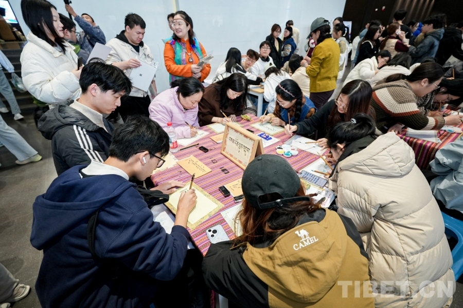 圖為學(xué)生正在體驗(yàn)藏文書法