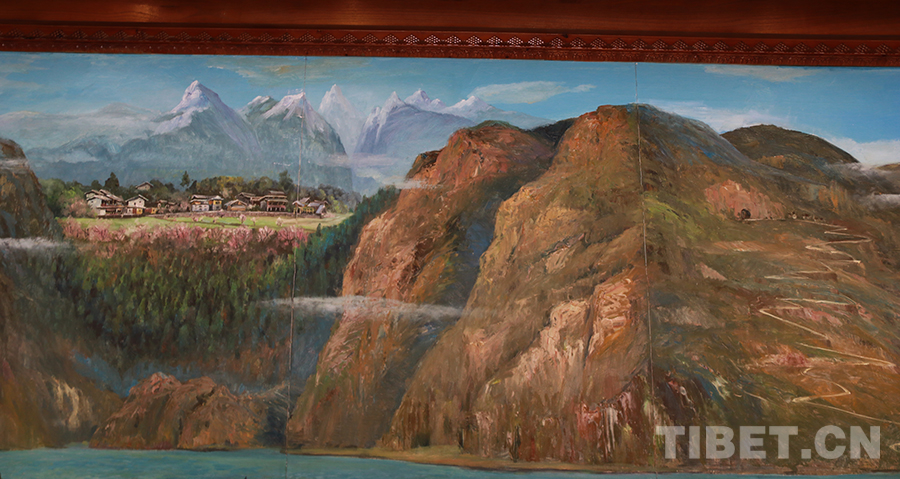 圖為色龍村內(nèi)建筑上的壁畫,生動(dòng)描繪了色龍村所處的特殊地理?xiàng)l件,右邊的盤山公路蜿蜒通過隧道之后而有左邊的“桃花源” 攝影:王妍丹