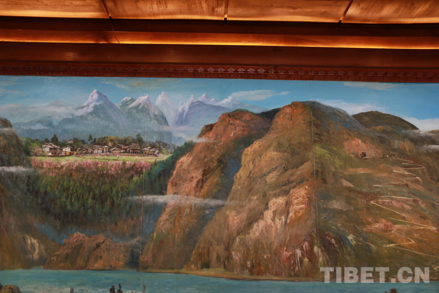 圖為色龍村內(nèi)建筑上的壁畫,生動描繪了色龍村所處的特殊地理條件,右邊的盤山公路蜿蜒通過隧道之后而有左邊的“桃花源” 攝影:王妍丹