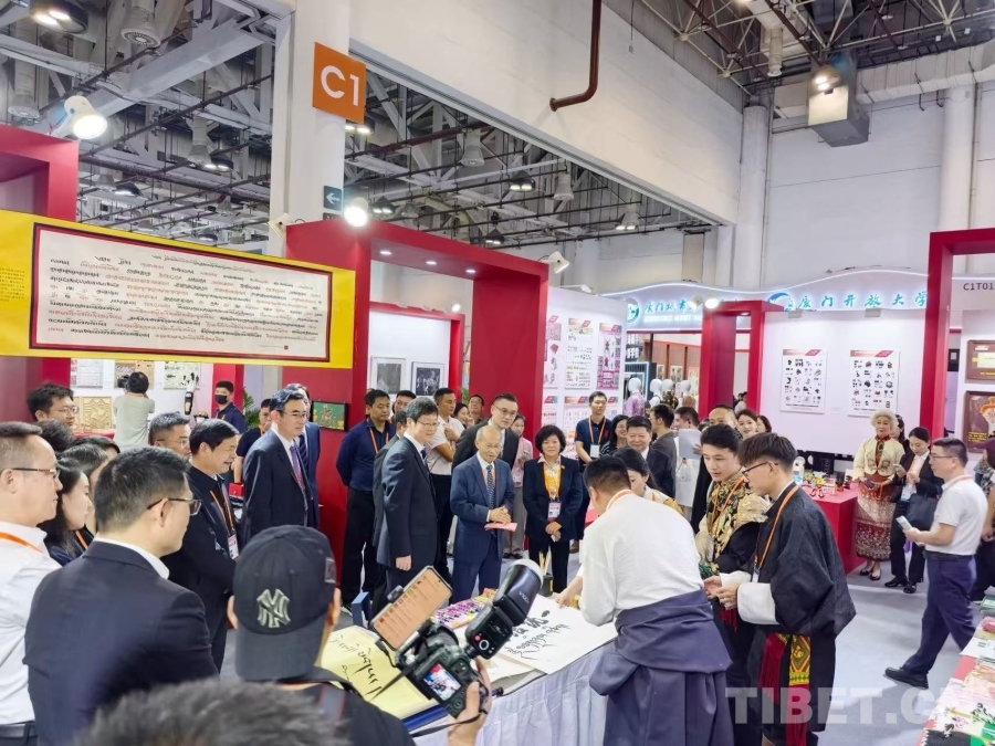 圖為西藏民族大學(xué)扎西曲吉參加第十六屆海峽兩岸(廈門)文化產(chǎn)業(yè)博覽交易會,現(xiàn)場書寫“團(tuán)結(jié)統(tǒng)一”的漢藏雙語書法作品并做講解