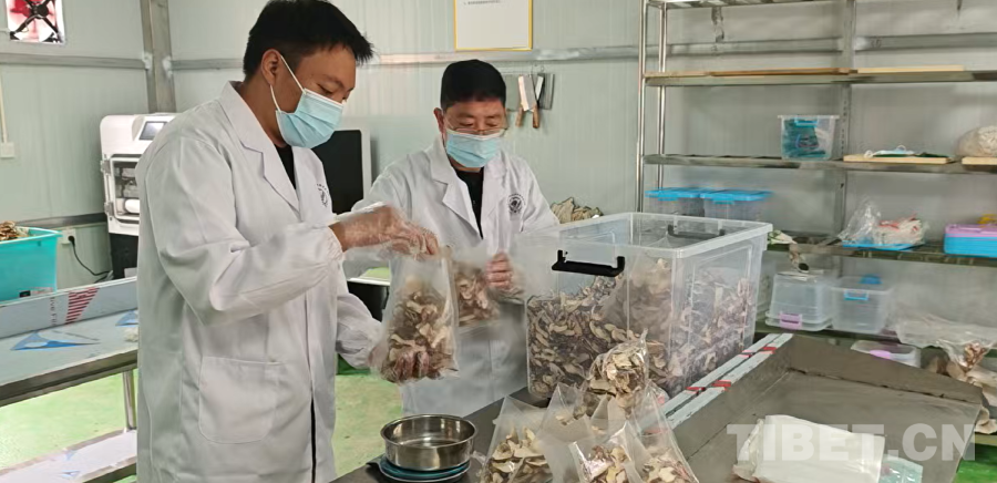 圖為駐村工作隊和村兩委在扎西村松茸加工廠包裝松茸干片