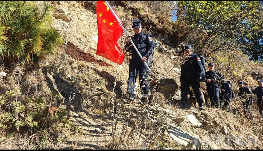 圖為民警在巡邊途中系上紅繩以作標(biāo)記