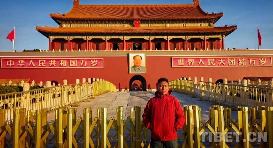 圖為西藏自治區(qū)那曲市色尼區(qū)青少年足球隊中場球員多杰頓桑在天安門廣場與國旗合影 攝影:劉莉