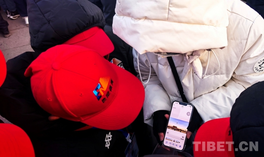 圖為熱心游客為西藏自治區(qū)那曲市色尼區(qū)青少年足球隊的少年們一行播放用手機拍攝的升旗儀式視頻 攝影:劉莉