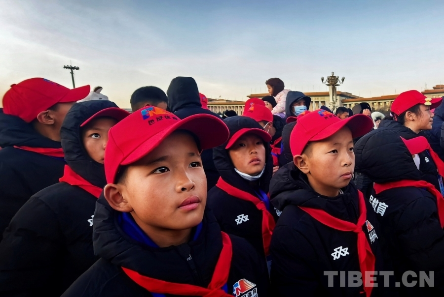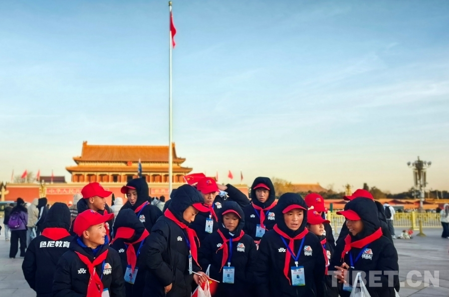 圖為西藏自治區(qū)那曲市色尼區(qū)青少年足球隊左邊鋒羅布占堆(前排左一)在天安門廣場觀看升旗儀式 攝影:劉莉