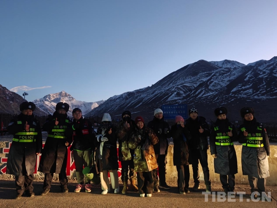圖為傍晚時(shí)分民警與游客在珠峰腳下合影留念