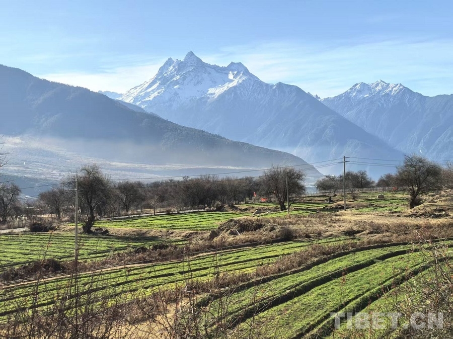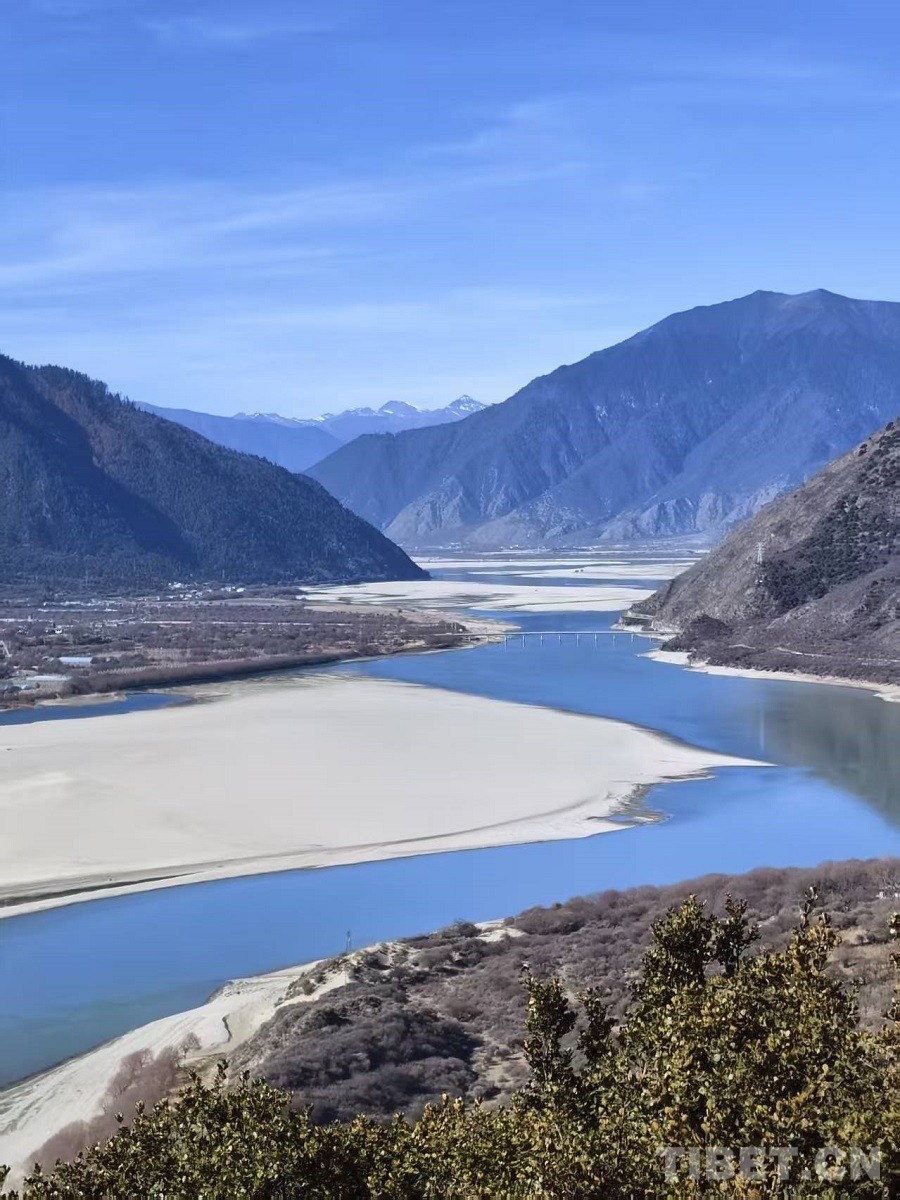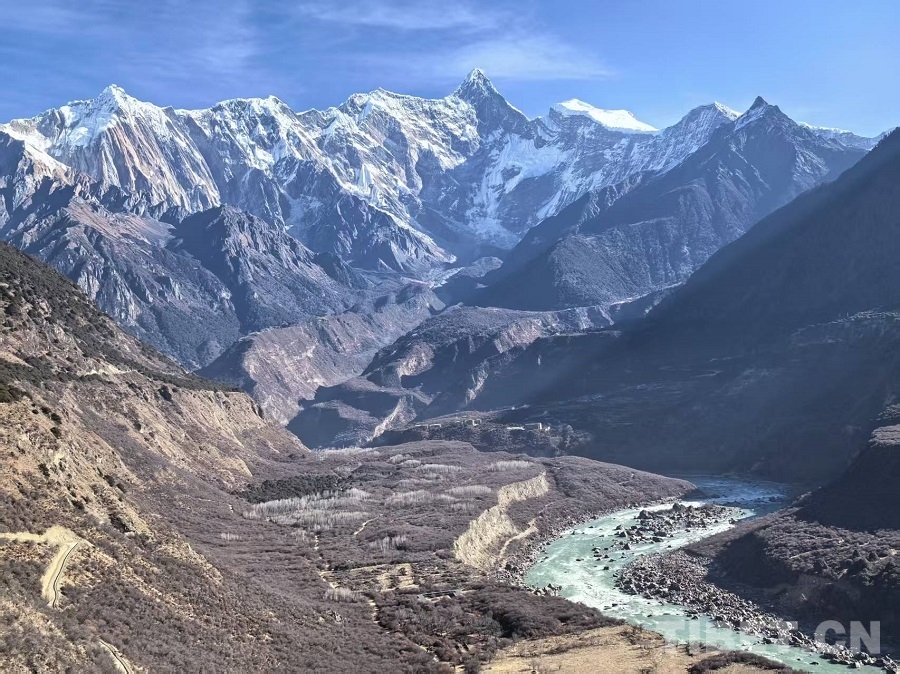冬日,雅魯藏布大峽谷靜默如詩(shī)。江水凝為碧藍(lán)玉帶,蜿蜒穿行山間。驅(qū)車沿山路前行,掠過田舍與松林,驀然抬首,巍峨雪山撲面而來——陽光璀璨,峰巔銀光灼灼,在蔚藍(lán)天空下愈顯玉潔冰清。