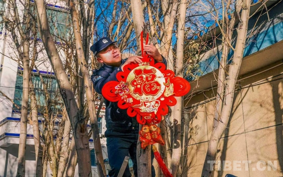 “來來來,搭把手!把這個中國結掛高點,看著喜慶!” 教導員楊曦淙踩著凳子將手中的中國結高高地掛在了樹上,新警吳措多杰在下面扶著梯子,仔細調整著高度。另一邊,民警們三五成群,有的拿著漿糊貼對聯,有的忙著掛彩燈,營區(qū)的每一個角落都被點綴得喜氣洋洋。