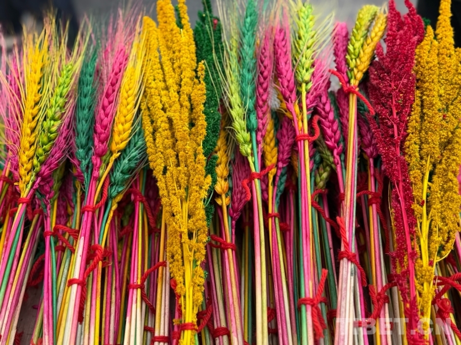 圖為藏年花,藏語稱為“羅薩梅朵”,是用麥穗染成藍、黃、綠、紅等顏色,寓意豐收美滿。