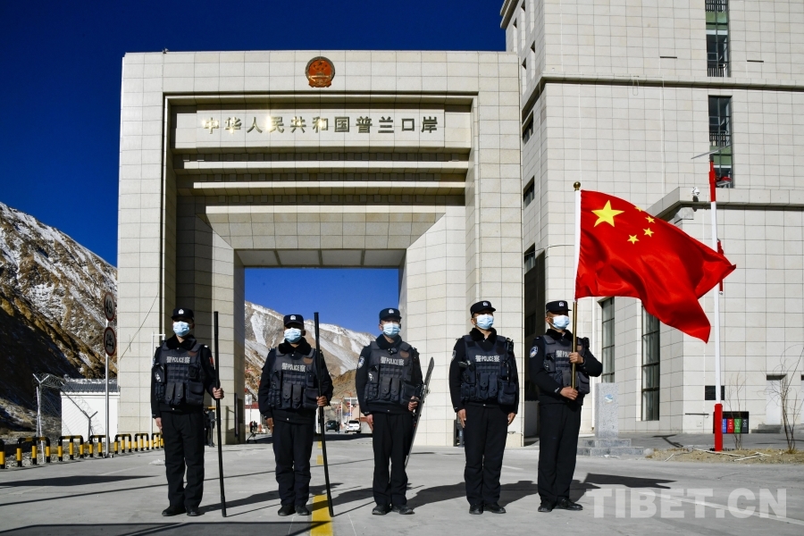 圖為民警董慶敏、巴桑歐珠、羅澤華、索朗多布杰、甘曉虎(從左至右)在普蘭口岸向全國人民拜年 攝影:趙振宇