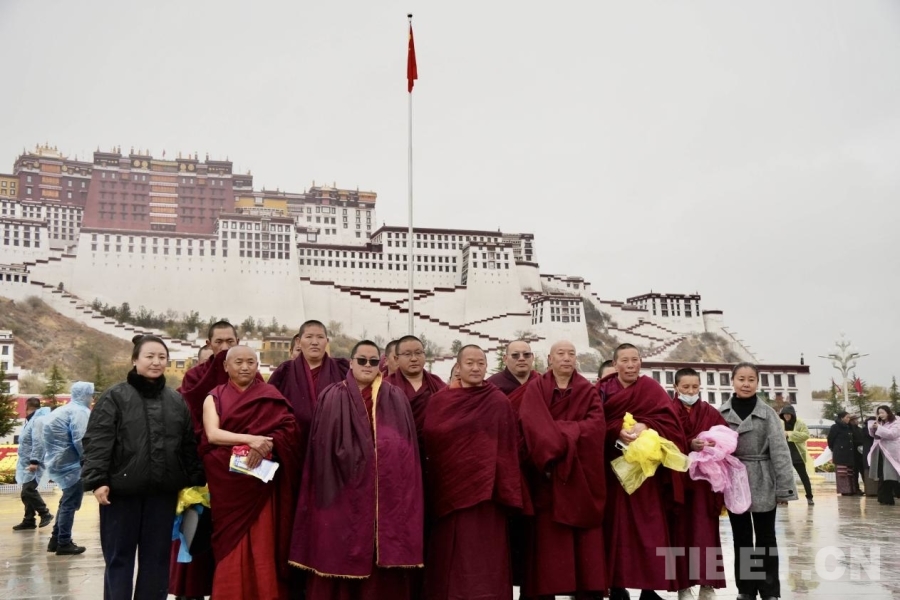 參加升旗儀式的寺院僧尼在布達拉宮廣場合影留念